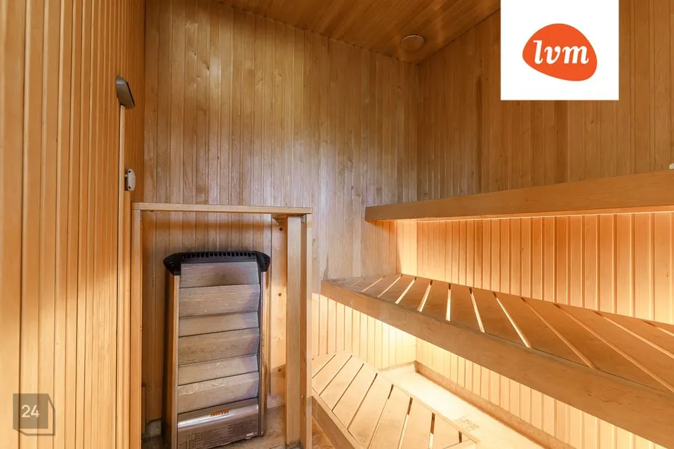 просторный лестничный холл, который используется как открытый домашний офис, три отдельные спальни, две из которых имеют вместительные встроенные гардеробы, очень большая ванная комната и сауна, где туалет отделен стенкой, в ванной комнате ванна, душ, сауна и еще немного дополнительного места.