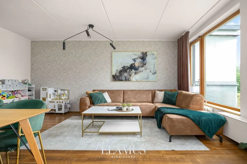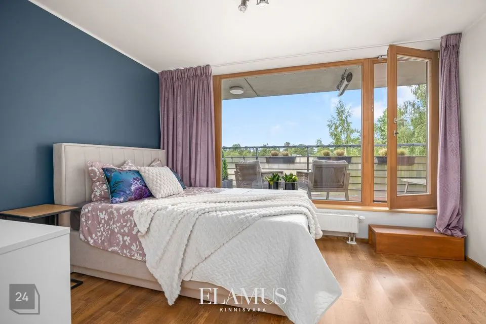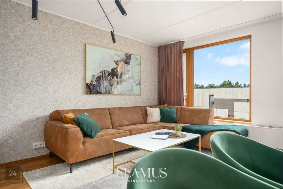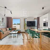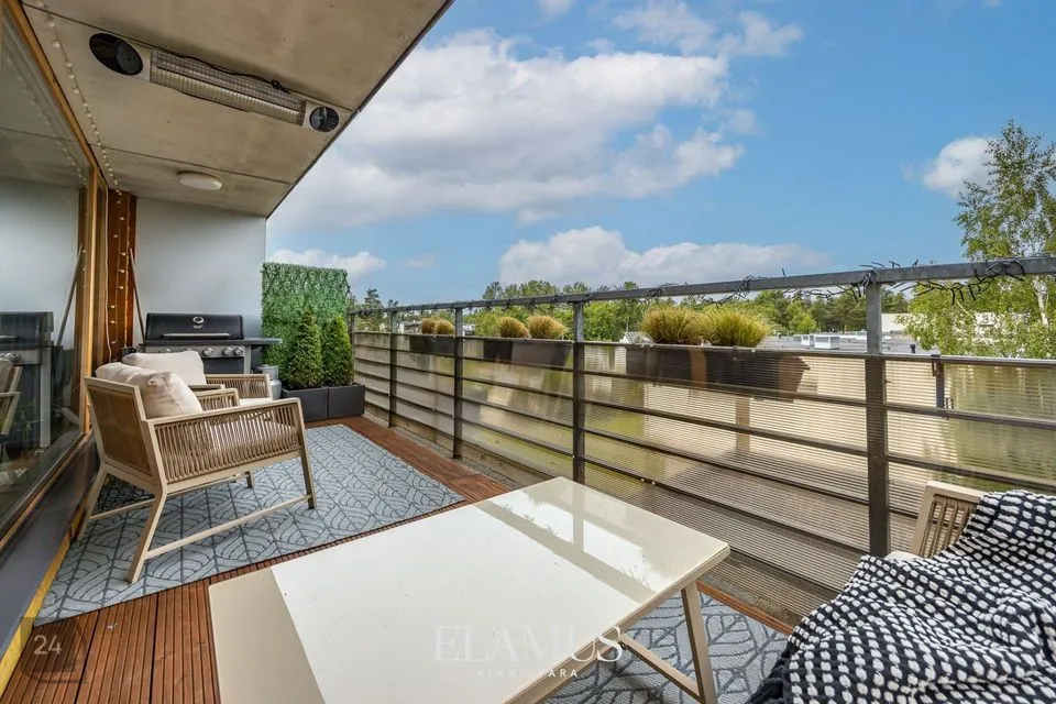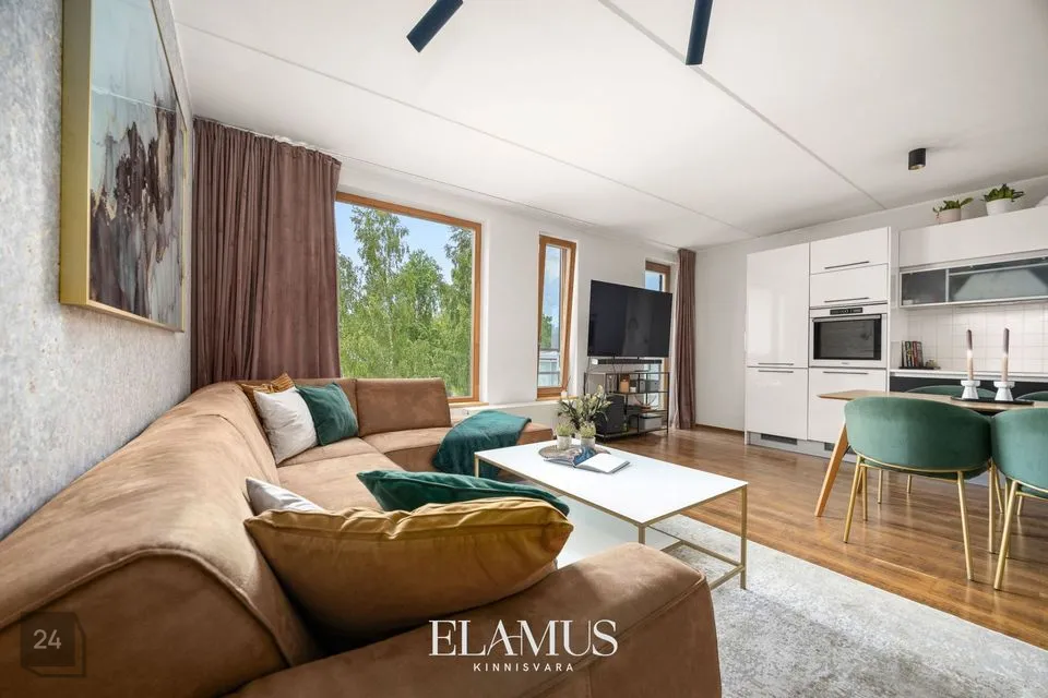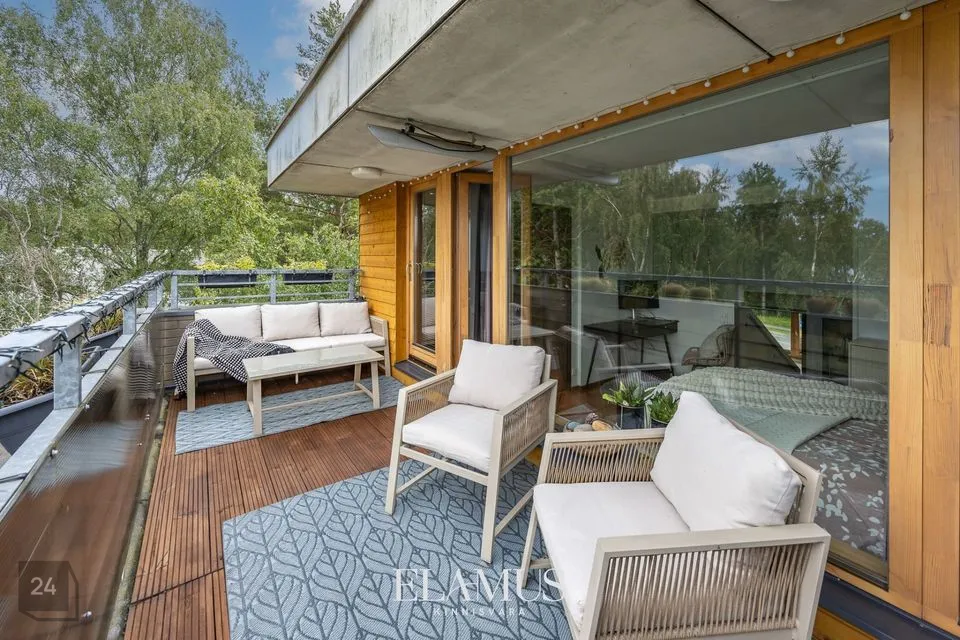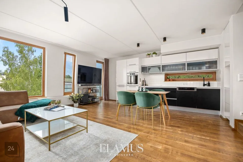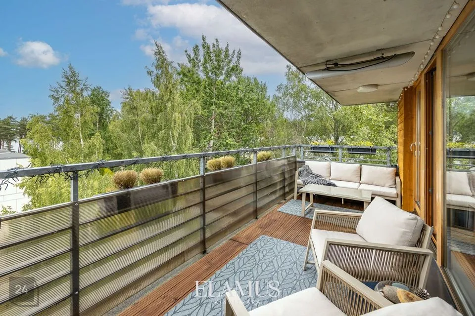 Открытая кухня и гостиная ведут прямо на застекленный балкон площадью 2,8 м², откуда открывается приватный вид.