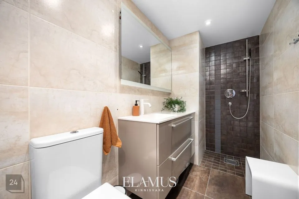 Также ванная комната с душем, ванной с подсветкой и мебелью от Balteco на заказ. Полы выложены плиткой с подогревом.