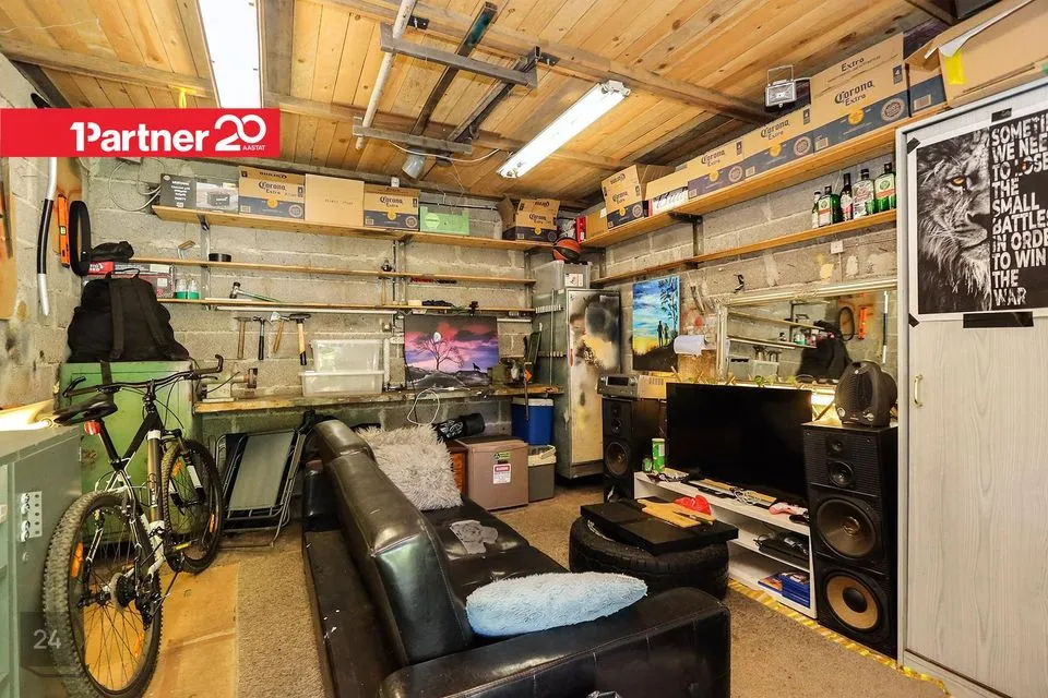 GARAGES The apartment includes two garages, with the older one (21.0 m²) being used as storage and the newer one (25.5 m²) used as a recreation area and partially as storage. The larger garage is equipped with industrial electricity and also has an attic space for additional room. In the future, a larger vehicle can be successfully stored in the larger garage.