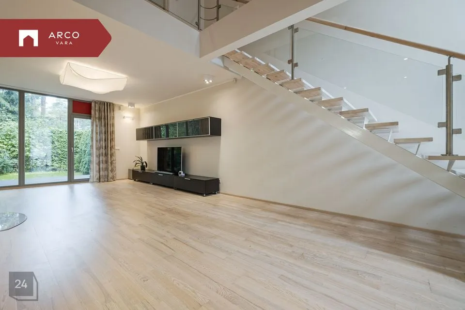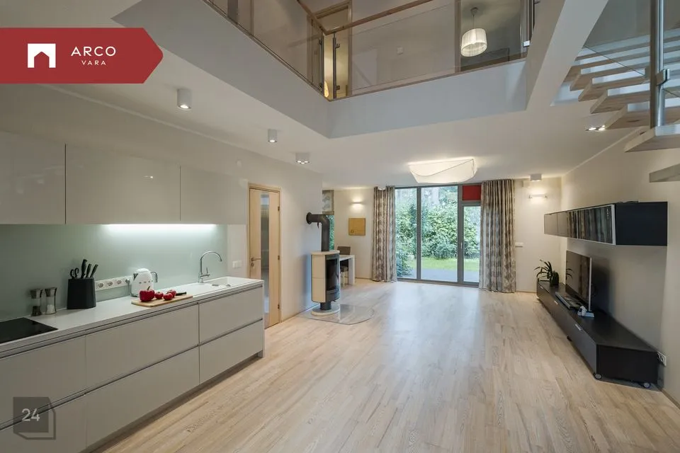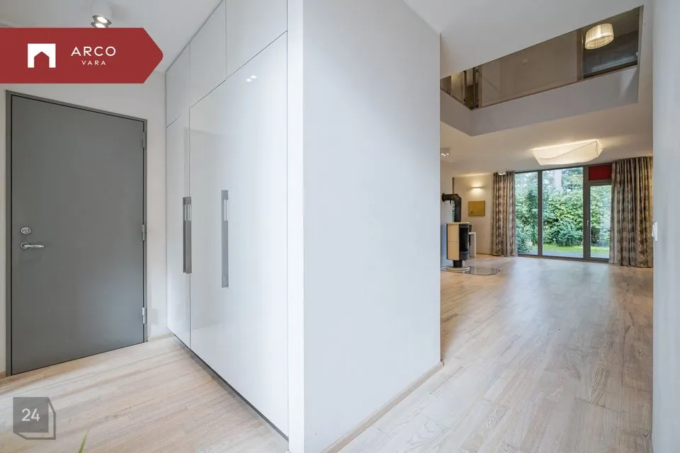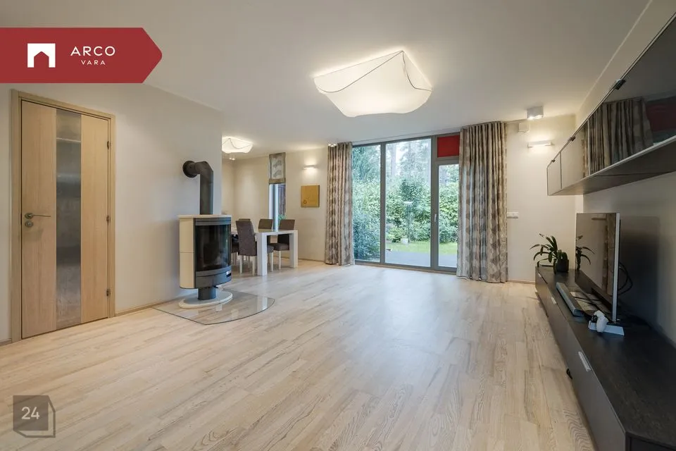 Esimesel korrusel asub esik avara garderoobiga, mis ühendab garaaži eluruumidega. Avatud planeeringuga elutuba on ühendatud köögi ja söögialaga, kust pääseb terrassile ja oma privaatsesse aeda. Elutoas on hubasust loov kamin.