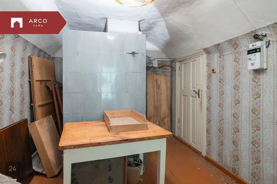По планировке на первом этаже расположены прихожая, коридор, помещение для туалета, кухня и три комнаты, одна из которых проходная. На втором этаже находится одна комната и есть возможность обустройства дополнительных помещений. В настоящее время отопление осуществляется печным способом, на кухне имеется плита. Точное состояние отопительных приборов неизвестно.