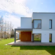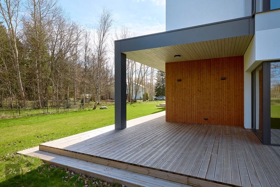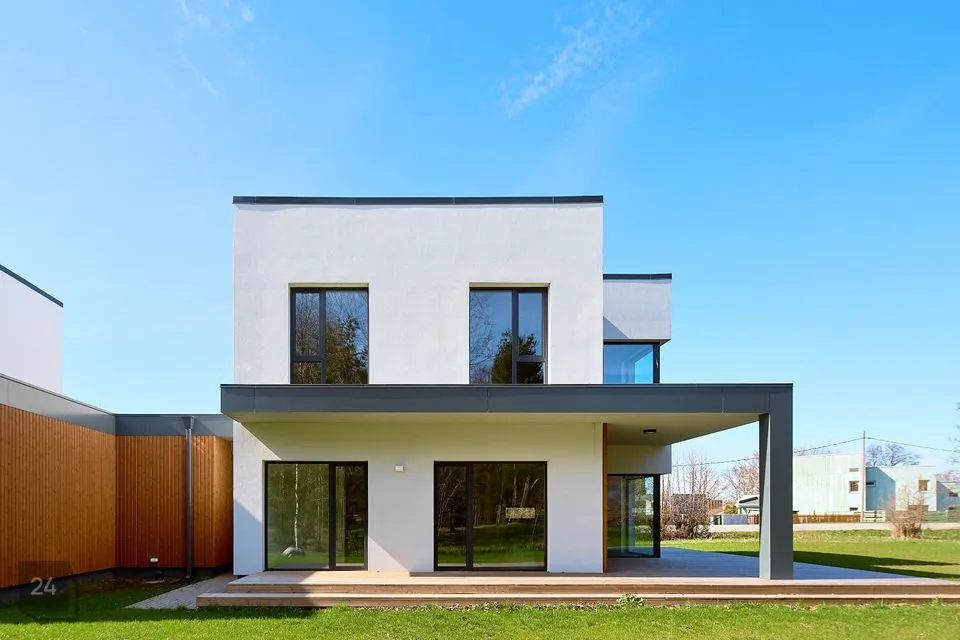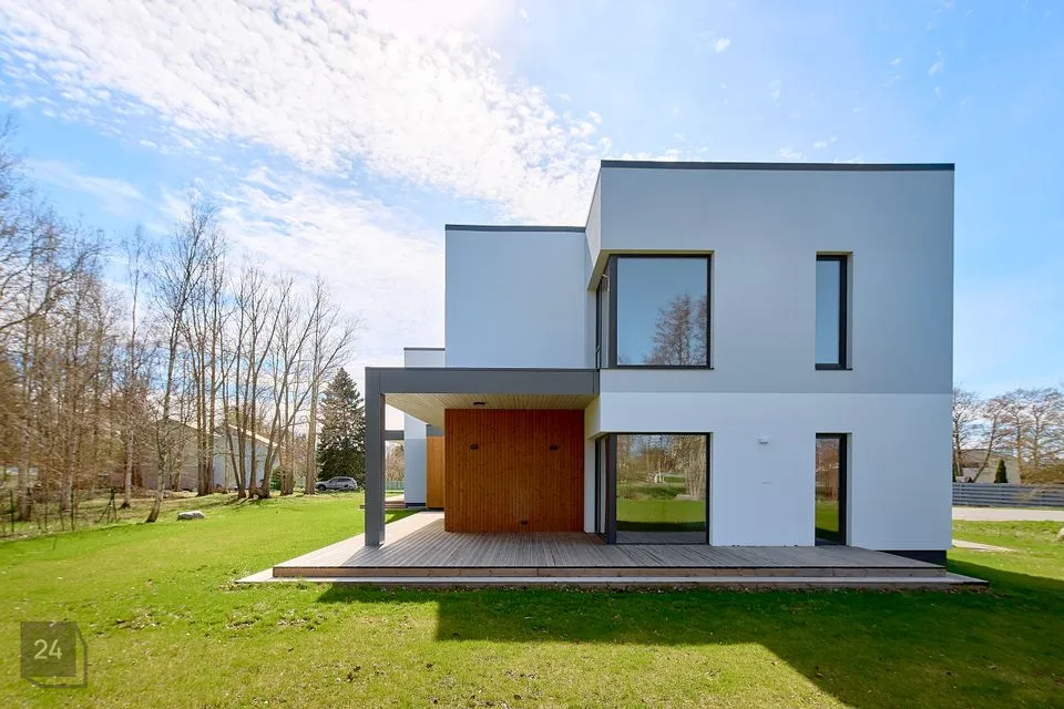 Fassaad on osaliselt krohvist, puidust ja fassaadpaneelidest