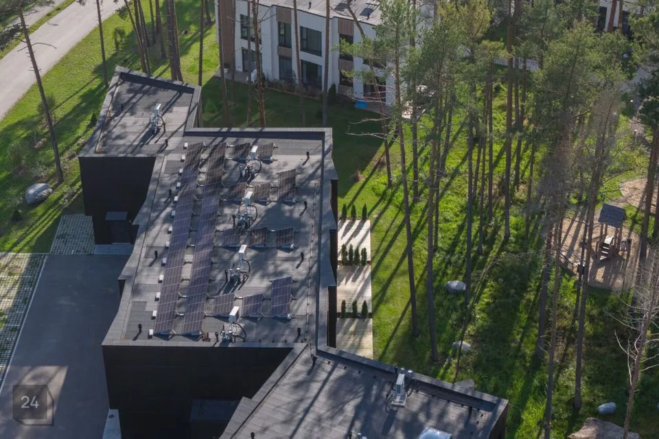 The project has an A-class energy rating. Solar panels are installed on the roofs of the buildings.
