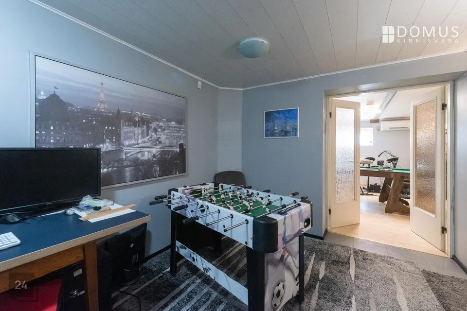 Kõige alumisel korrusel on nn hobiruumid, kus eraldi köök ja mida võiks kasutada ka laste elamise ruumidena. Sealne kamin on vaid dekoratiivse iseloomuga ja ei ole mõeldud päris küttekaminana, kuid annab effekti siiski. Alumisel korrusel on ka jõusaal/sauna eesruum, eraldi wc ja saun koos pesuruumidega. Lisaks on veel eraldi sissepääsuga korraliku suurusega töötuba kus saab tegeleda näiteks puidutöö hobiga vms.