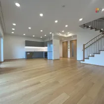 Põrandatel on naturaalne 1-lipiline tammeparkett ja elutoast viib teisele korrusele tammepuidust trepp.