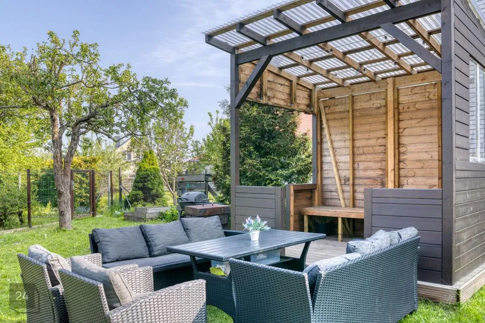Õuest pääseb väga avarasse garaaži ning tehnoruumi ning maja taga, sisehoovis on mõnus ning hubane paik grillimiseks katusealusega grillmaja näol ning pere pisematele laste mänguväljak. Samuti on suureks boonuseks aias kasvavad kandvad viljapuud – kirsid, õunad (eri sordid, mis valmivad eri aegadel) ning aiaserva istutatud 24 elupuud, mis hetkel on juba 2 meetri kõrgused.