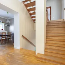 Uksest sisenedes on väike eeskoda, kuhu saab mugavalt jätta jalatsid ning astuda tuppa, kust vasakut kätt jääb esimene tualettruum ning väike garderoob üleriiete jaoks. Edasi pääseb kööki, kus on parajalt ruumi ja söögilaua jaoks ning kust pääseb ka otse hoovi, et suviseid õhtusööke hoopis seal mõnusa õhtupäikese käes nautida. Köögist mööda liikudes aga jõuab trepihalli, kust alla liikudes pääsev mõnusalt avarasse ning kõrgete lagedega ja suurejoonelise disainiga kaminaga elutuppa. Elutoast läbi, trepist veelkord alla liikudes leiab eest saunaeesruumi, sauna koos Harvia elektrikerisega ning teise tualettruumi ja duširuumiga, väikse veinikeldri, majapidamisruumi koos pesumasinaga ning veel väikese panipaiga kas või hooajaliste rõivaste hoiustamiseks.