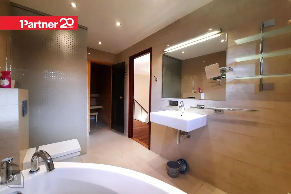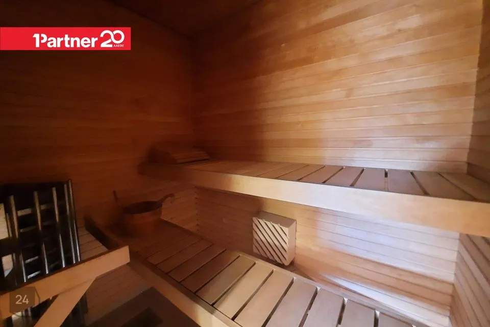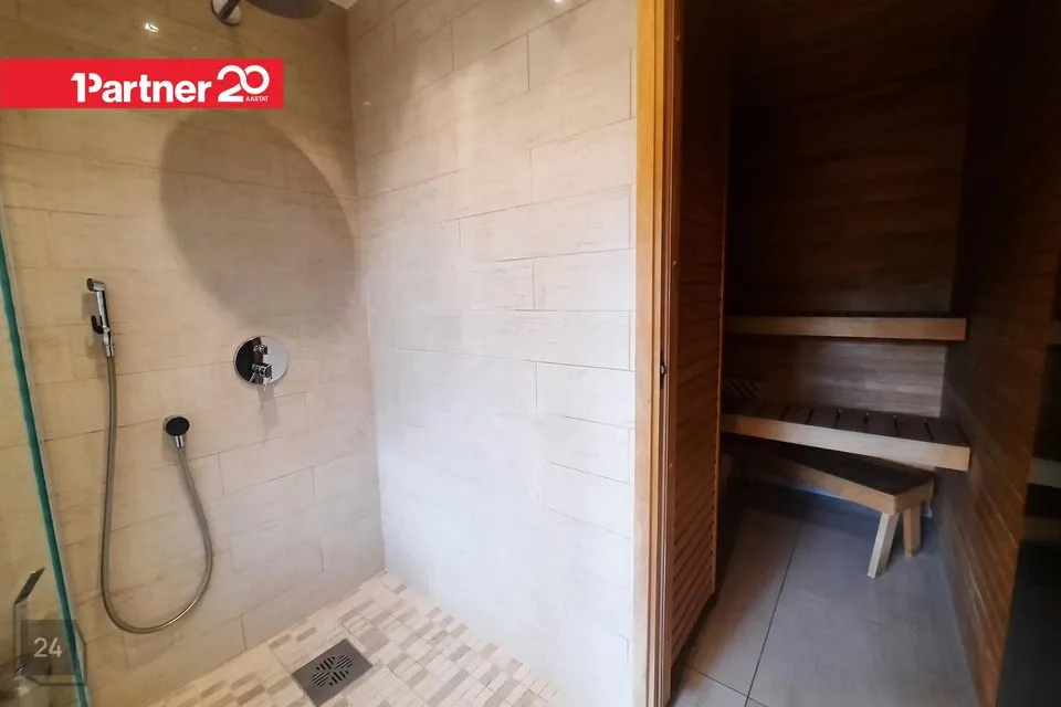 Teisel korrusel on ka omaette duširuum mullivanni, dušinurga, wc ja elektrisaunaga. Duširuumi põrandat ja seinu katavad heledates toonides keraamilised plaadid.