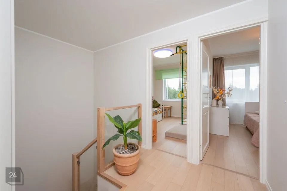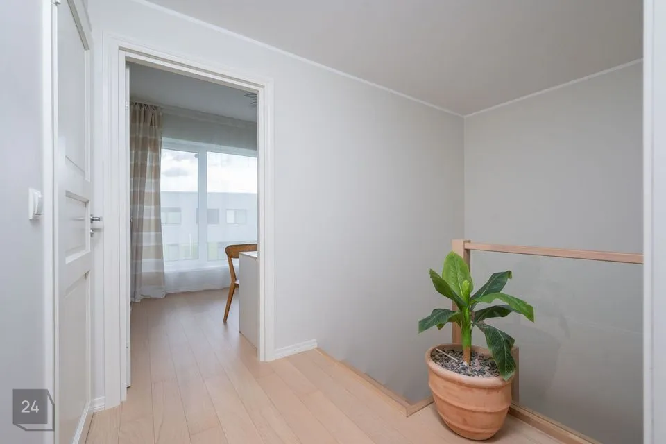 Ridaelamuboks on viimistletud heledates ja pastellsetes toonides, mis loovad avara ja helge õhkkonna. Tubade põrandatel on naturaalne parkett, esikus ja köögiosas keraamiline plaat. Sanitaarruumide seinad ja põrandad on viimistletud keraamiliste plaatidega.