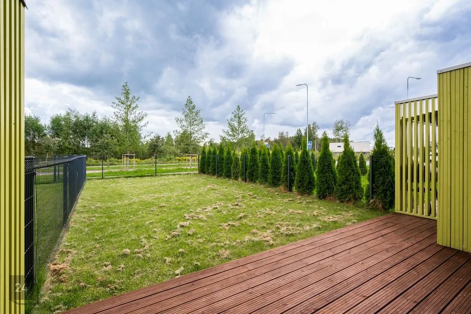 Esimesel korrusel asub avar elutuba avatud köögiga, panipaik, duši- ja tualettruum ning saun. Elutoast ja pesuruumist pääseb otse terrassile ja haljasalale, mis on piiratud aiaga.
