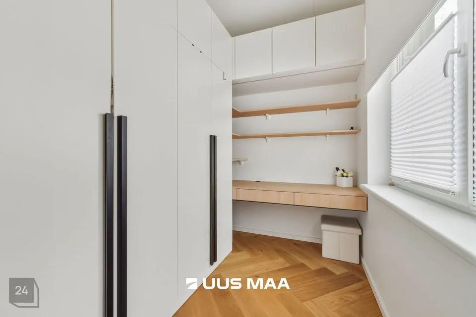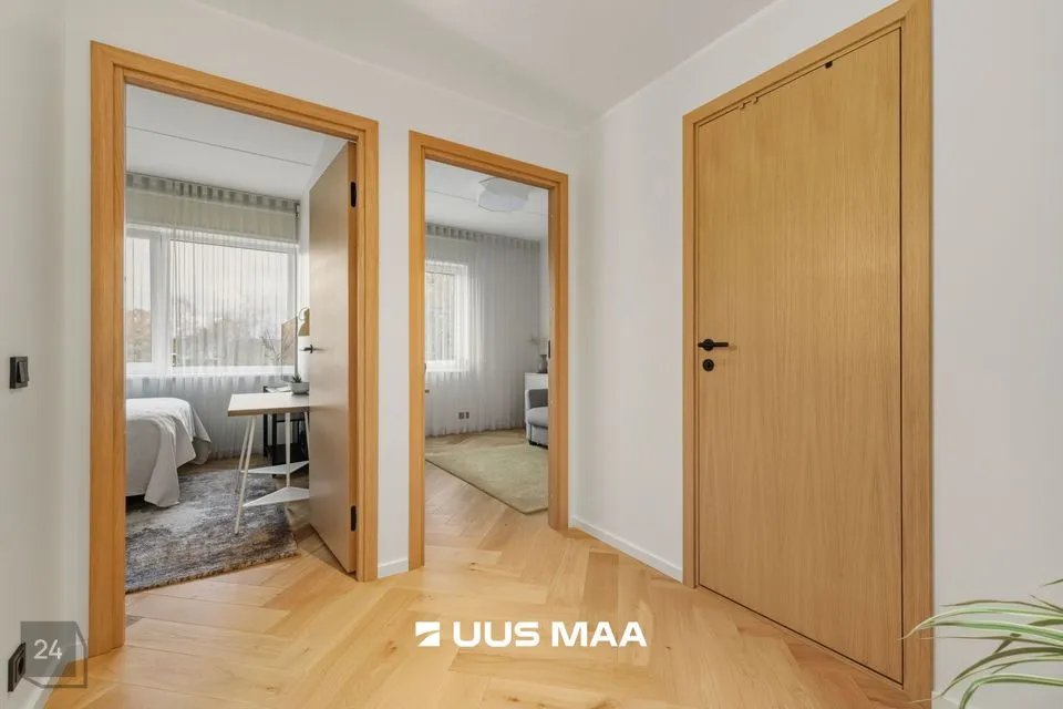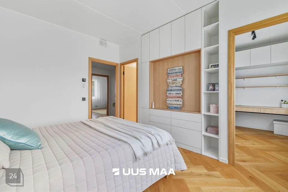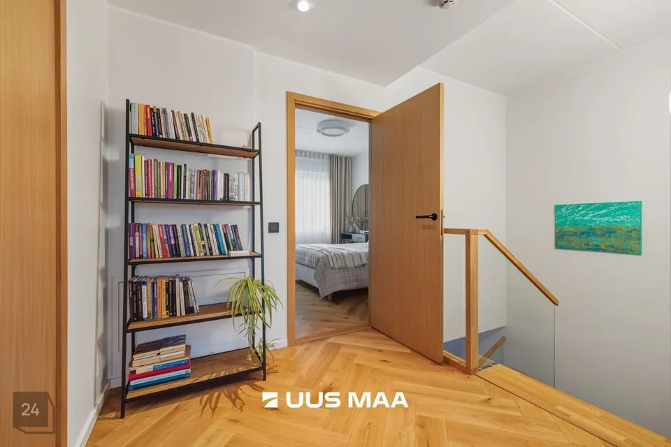 Teisel korrusel asub kolm magamistuba, millest üks on privaatne – oma vannitoa ja walk-in-garderoobiga, mis pakub vaikust ja ruumi iseendale. Garderoobi on loodud ka valgustusega kodukontorinurk, mis lisab ruumile funktsionaalsust. Ülejäänud toad sobivad suurepäraselt laste, külaliste või täiendava kodukontori jaoks. Kõikide magamistubade akendel on puldiga juhitavad pimendavad aknakatted, mis lisavad mugavust ja luksust. Teise korruse koridoris asub vanniga kolmas vannituba ja WC, mis sobib hästi laste või külaliste kasutusse.