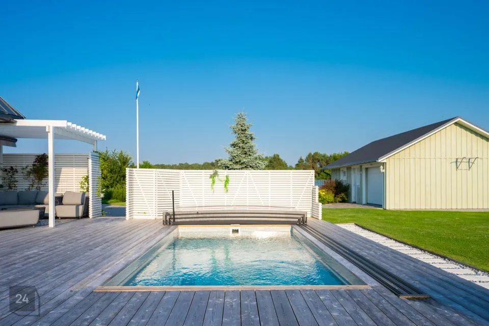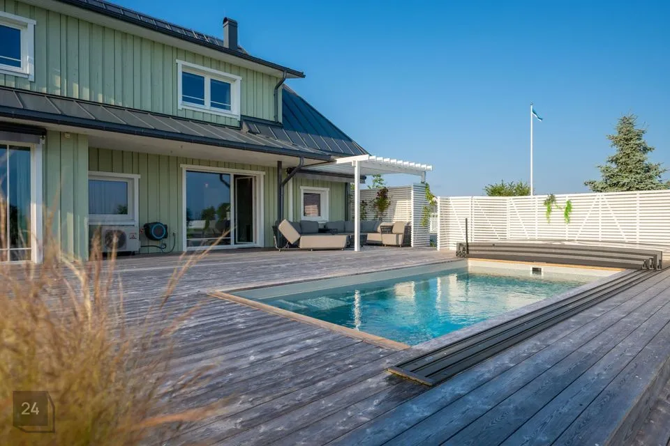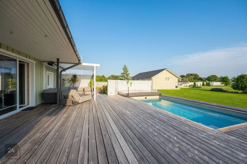 Eramu paikneb suurel, hoolitsetud kinnistul, kuhu on äsja rajatud uus kvaliteetne puitaed, samuti on värskelt uuendatud kogu hoov, haljastus ning tänavakivid, mis on tasandatud ja uuesti laotud. Kinnistul asuvat rohelust hooldab automaatne Husqvarna robotniiduk. Hooviala valgustus on samuti täielikult uuendatud ning turvalisust tagavad kaugjälgitavad turvakaamerad. Maja on 2024. aastal läbinud põhjaliku kapitaalremondi, mille käigus on tehtud fassaadi ja katuse soojustustööd, vahetatud enamik aknaid ning uuendatud nii siseviimistlus kui ka tehnosüsteemid. Kõik need tööd tagavad kaasaegse ja energiasäästliku elukeskkonna. Lisaks on majale paigaldatud 8 kW päikesepaneelid koos akupangaga, tagades mõistlikud elektrikulud ning stabiilse ja kvaliteetse vooluvarustuse kogu majapidamisele. Suvisel ajal on elektriarved olnud keskmiselt 50–60€ ja talvel ca 250€, millele lisanduvad ainult vee- ja prügiveo kulud. Hoone juurde kuulub avar, umbes 125 m² suurune terrass, kuhu on nüüdseks integreeritud ka basseinikompleks. Basseini kütmine toimub energiasäästliku õhksoojuspumbaga, mis on paigaldatud spetsiaalsesse ilmastikukindlasse kappi. Filtrite ja pumbasüsteemide hoolduse teostab professionaalne ettevõte Basseinitehnika OÜ, tagades muretu kasutamise igal hooajal .