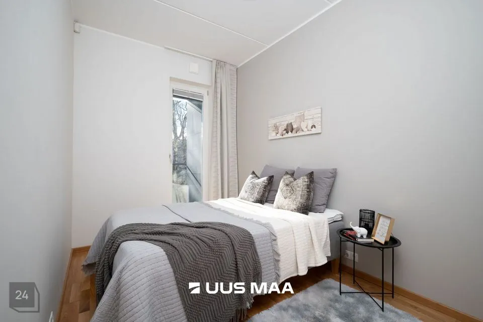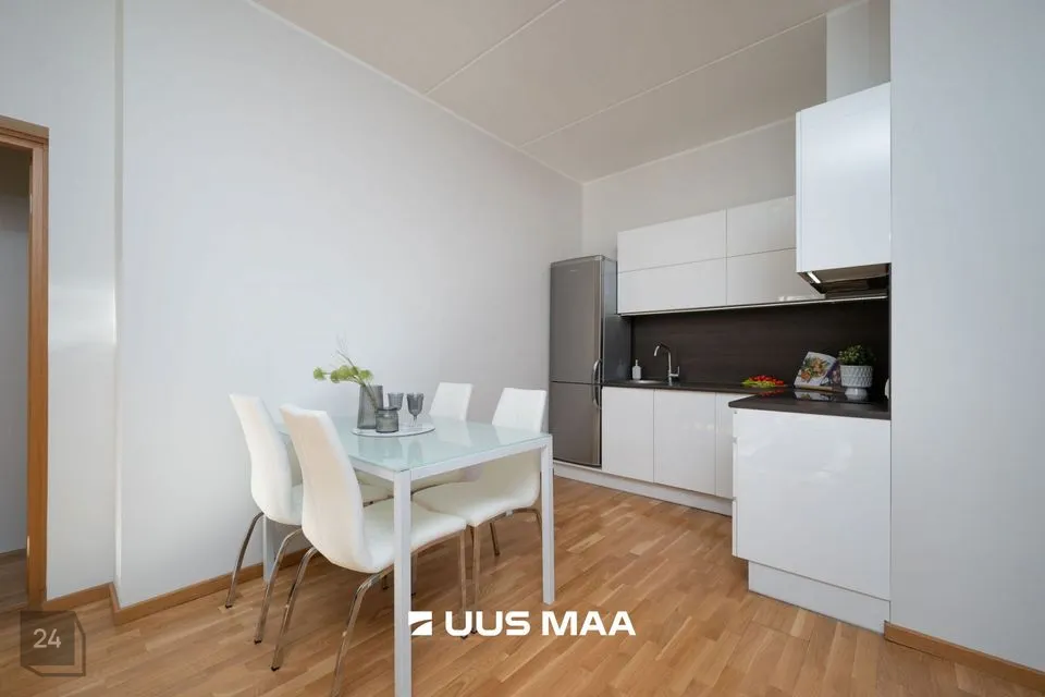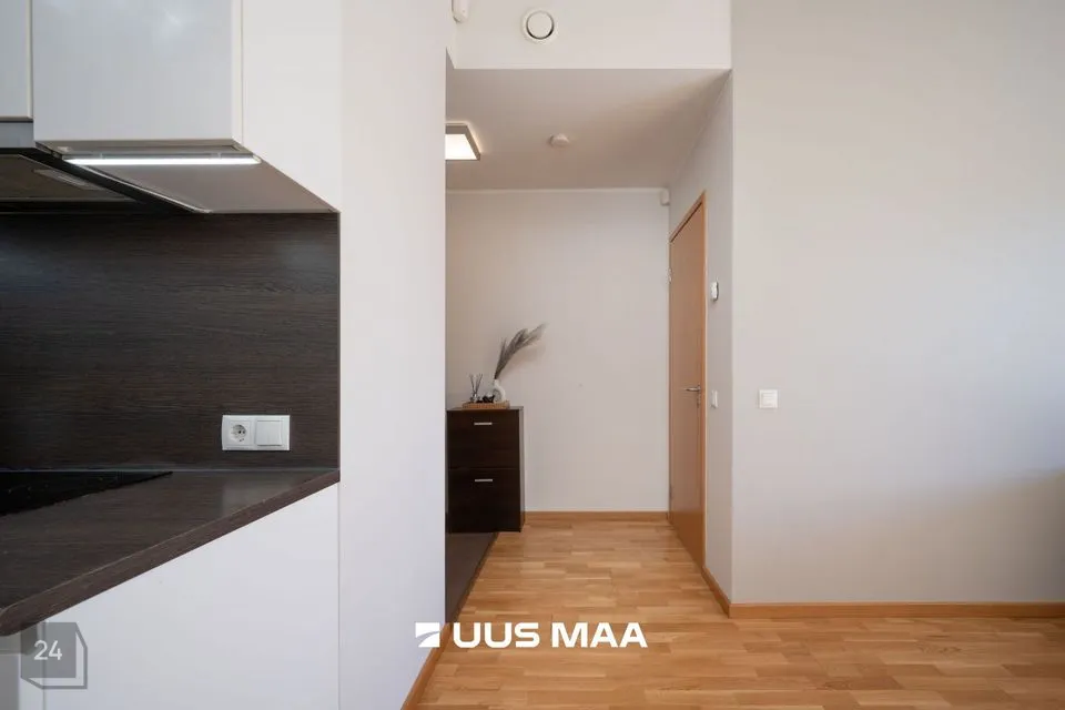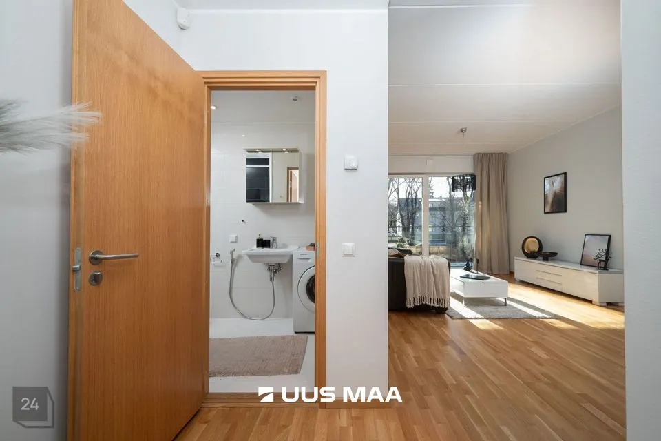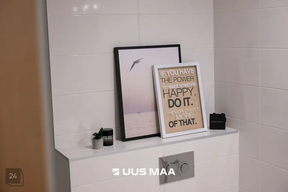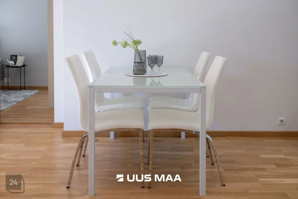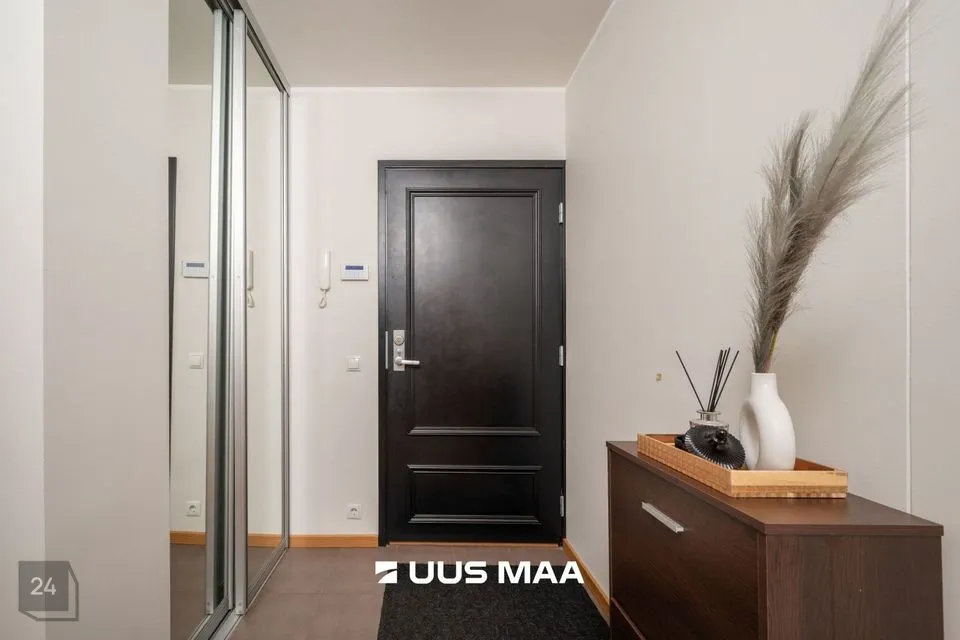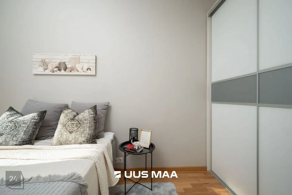 Korter on viimistletud heledates toonides, põrandaid katab naturaalne puitparkett. Esikus ja magamistoas on mahukad sisseehitatud garderoobikapid.