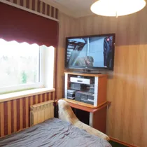 В квартире две комнаты, кухня, прихожая и ванная комната/туалет. Комнаты имеют отдельные входы из прихожей. Просторный вид на лес, много света.