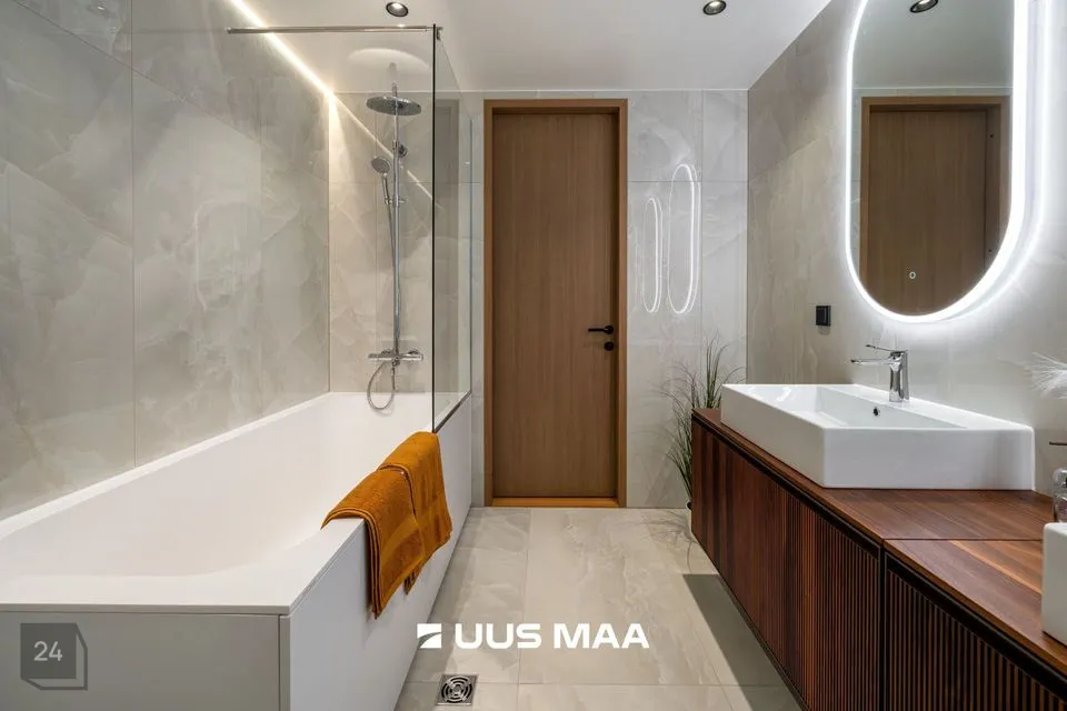 В ванных комнатах будет установлена высококачественная сантехника от итальянской компании Fima, а также керамика от брендов Flaminia и Valdama в сочетании с дизайнерскими тумбами для раковин.