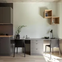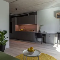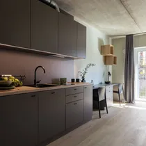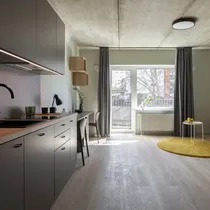 По-домашнему уютные студии с модным дизайном, собственной ванной комнатой и мини-кухней, столами со стульями, шкафом, удобным диваном или кроватью, а также большим количеством места для хранения в шкафах. На всех этажах есть бесплатные прачечные со стиральной машиной и сушилками. При желании вы также можете заказать дополнительные удобства, такие как парковочное место для автомобиля, уборка комнаты и многое другое.