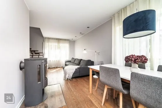 Сдается в аренду 3-комнатная квартира в двух уровнях! Квартира уютная, светлая и с большой террасой, расположена в районе частных домов Нымме! В состав квартиры входят: - на первом этаже: прихожая, кухня с открытой планировкой, совмещенная с гостиной, и туалет. В гостиной