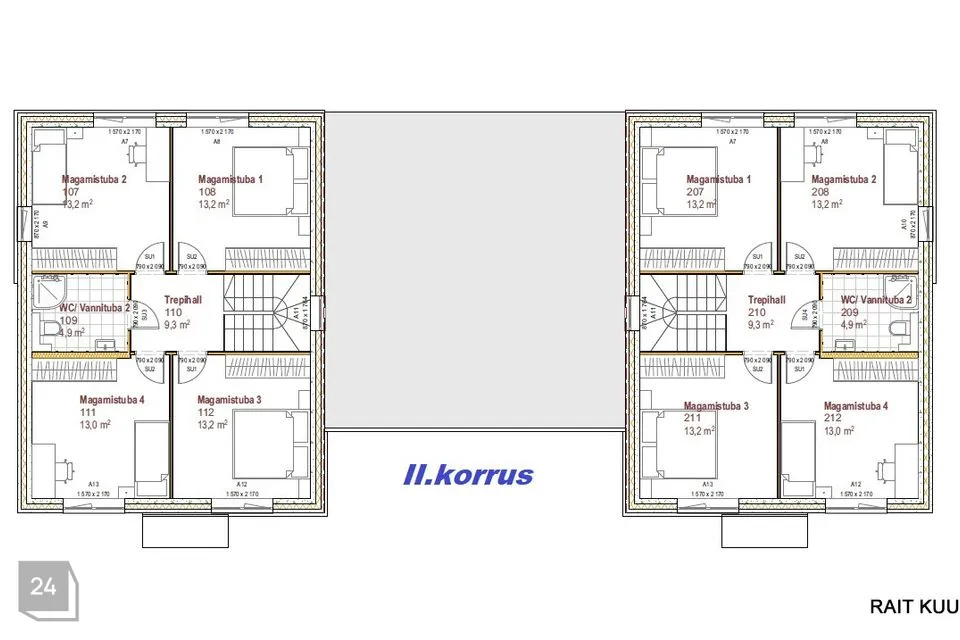 Teise korruse planeeringu kooseisu kuulub 4 magamistuba suurustega 13,0 m2 - 13,2 m2, trepihall ja duširuum-wc.