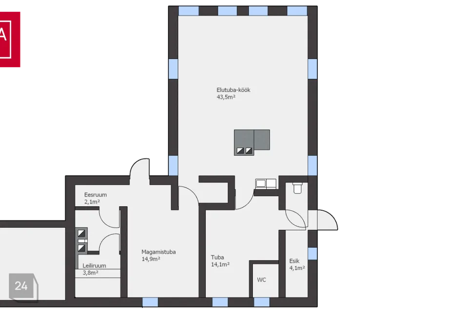 •Avar elutuba avatud köögi ja kaminaga – 43,5 m²