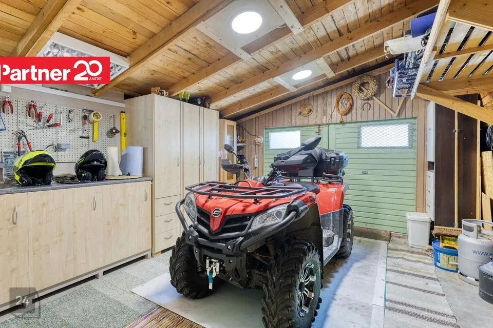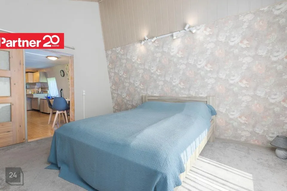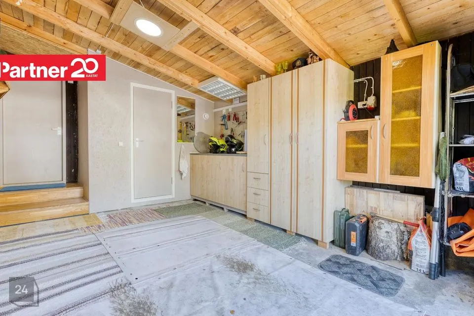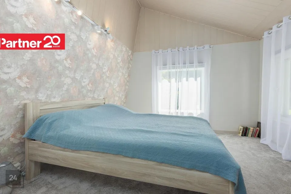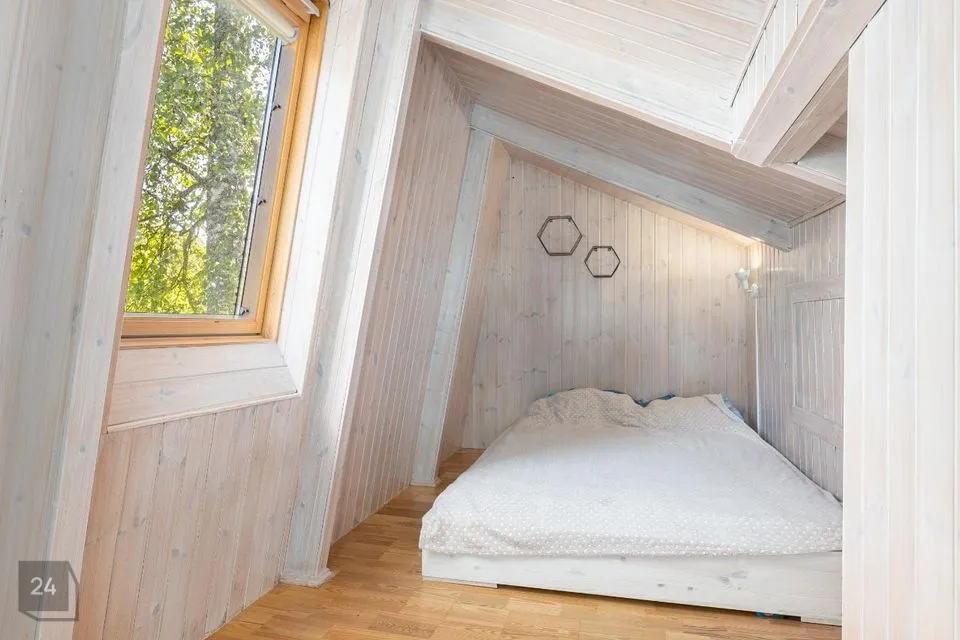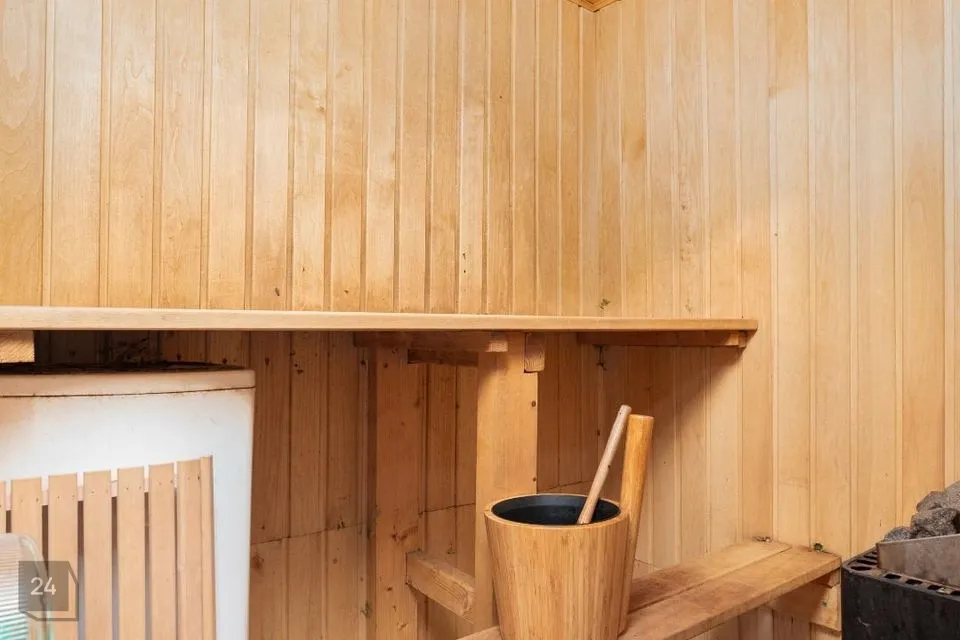 The second floor is covered with laminate parquet. Walls have wooden paneling or wallpaper, with ceramic tiles in wet rooms.