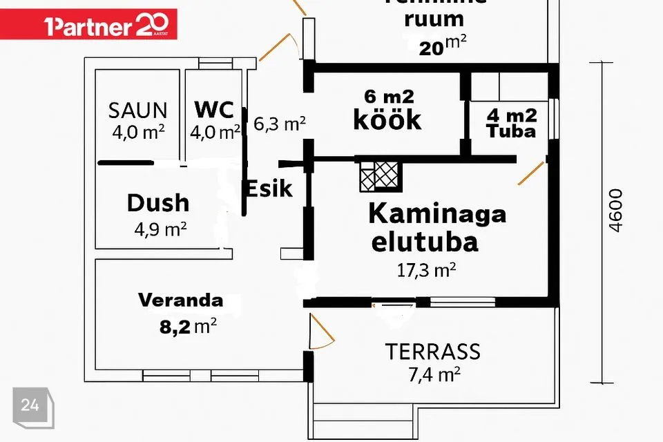 Suvila ruumiplaneering: veranda, esik, elutuba kaminaga, eraldi köök, väike magamistuba, saun, duširuum.