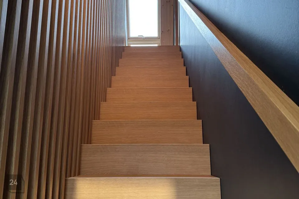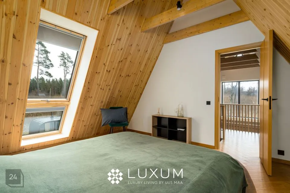 Maja ise on omanäolise karakteriga: kõrged kaldlaed ja valguse mäng loovad avara ning õhulise atmosfääri. Elutuba ja köök on ühendatud üheks tervikuks ja tänu ligi kaheksa meetrisele laekõrgusele on siin ruumi hingamiseks – nii kehal kui vaimul. Kaks magamistuba on privaatsed ja hubased, vannituba jätkab kogu kodu rahulikku, looduslähedast joont.
