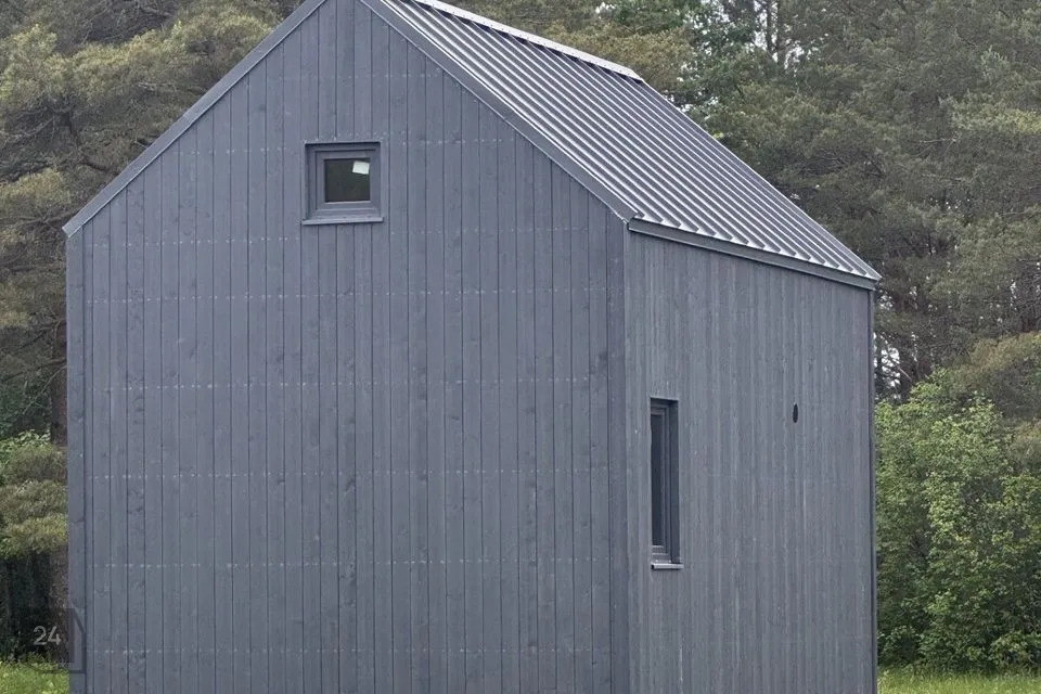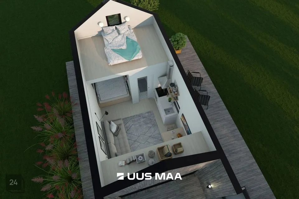 20,3 m² musta karbi kujul maja, mida saab lõpuni kujundada oma maitse järgi.