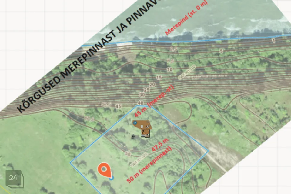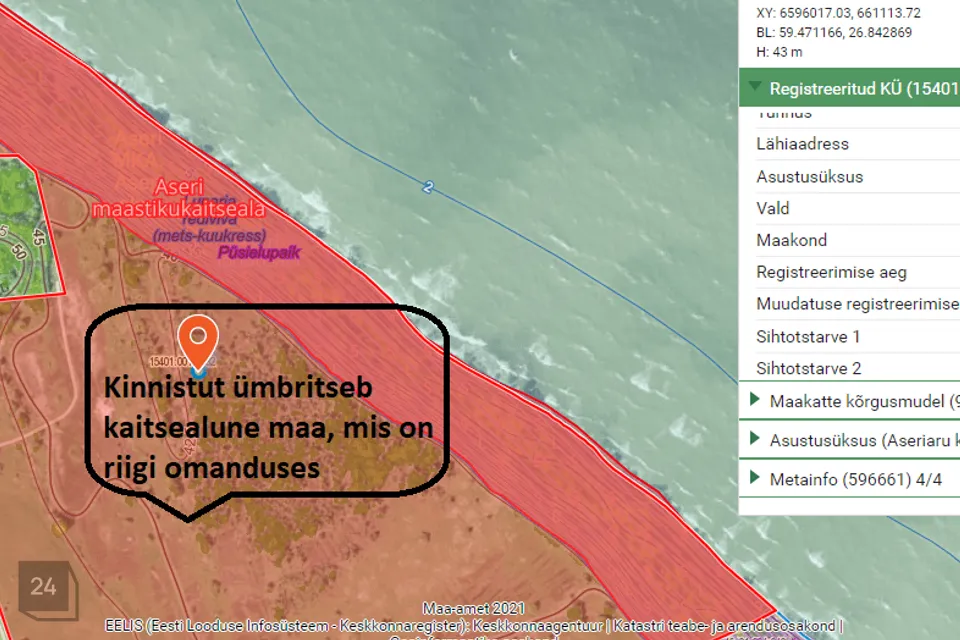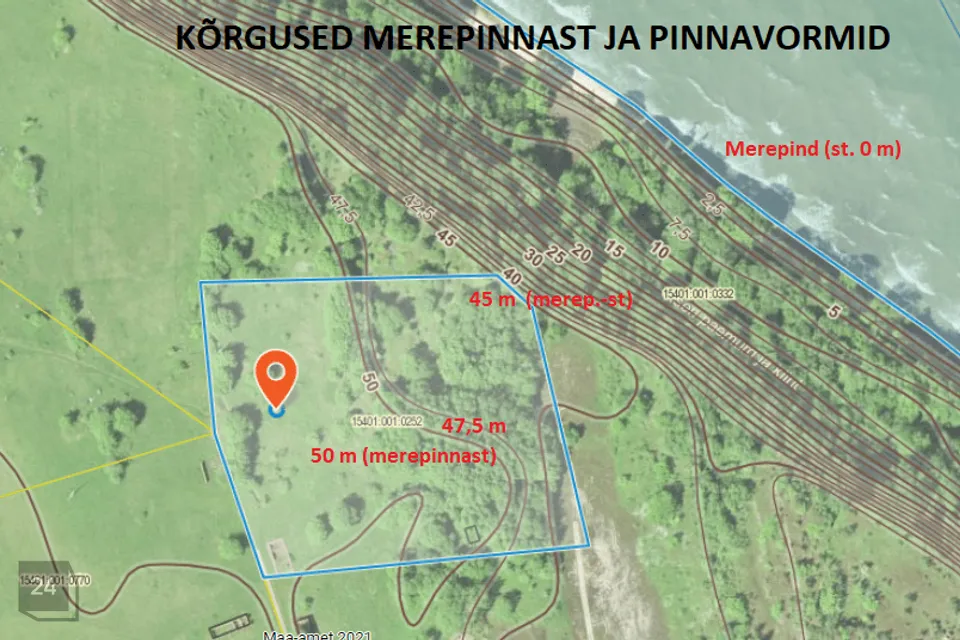 Müüa ainulaadne mereäärne pangapealne kinnistu (piirneb panga äärega). Kinnistu asub reljeefseelt kolmel kõrgusel merepinnast: (45 m; 47.5 m ja 50 m) tõustes mere poolt maa poole astangutena 7.5 m . Kinnistu kõrgem punkt võrdub 17 m. kõrguse kõrghoone kõrgusega (merepinnast) . Pankrannik mereni langeb trepjalt ca. 2.5 m. kõrguste ja 3-5 m. laiuste astmetena. Kinnistu on ümbritsetud mere poolt ja külgedelt riigimaadega, mis on looduskaitsealused ja ehituskeeluga.