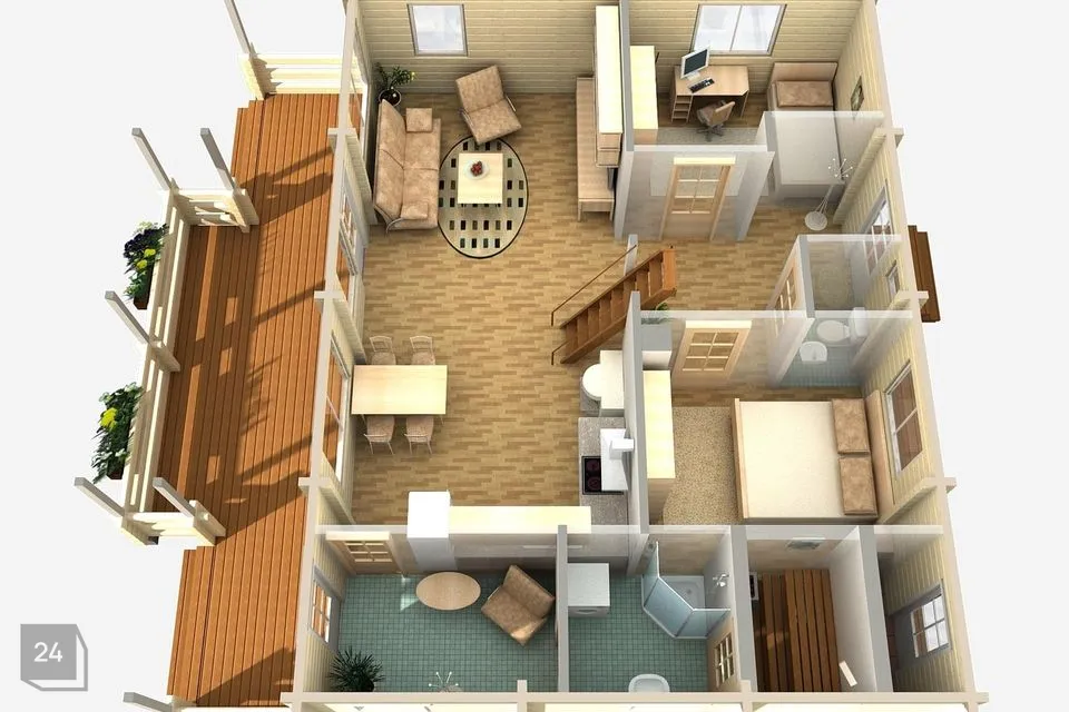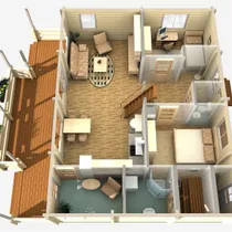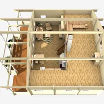 Maja ees on armas terrass ning sisenedes jõuate kaminaga söögituppa. Söögituba on üheltpoolt ühendatud elutoaga ja teiselt poolt avatud köögiga. Läbi söögitoa jõuab trepihalli, kust pääseb magamistuppa ja vannituppa.