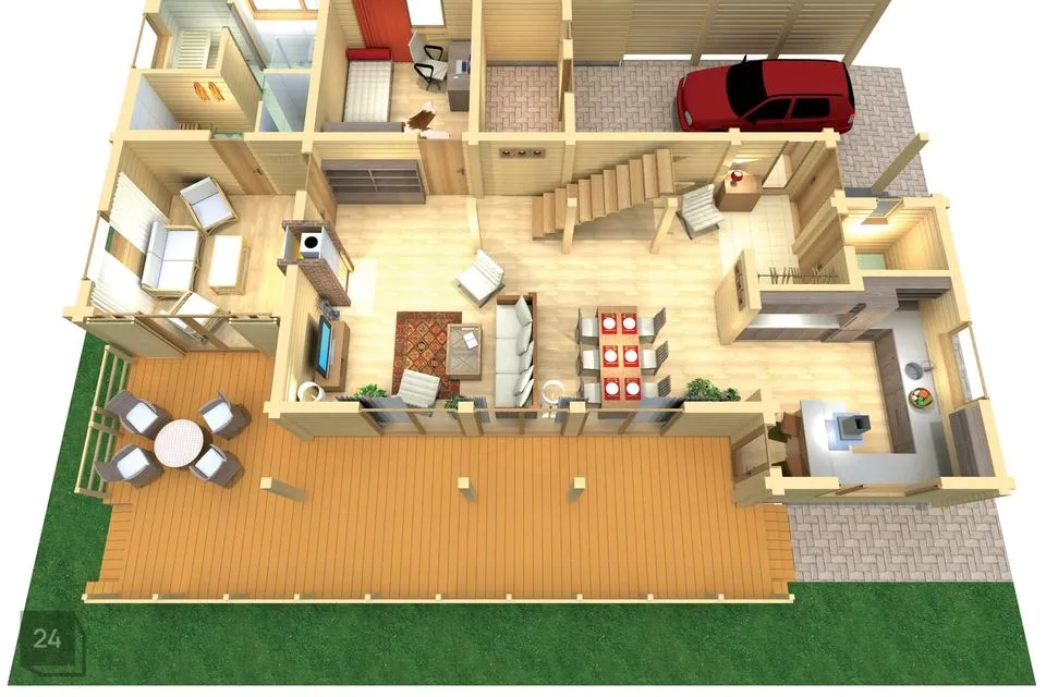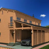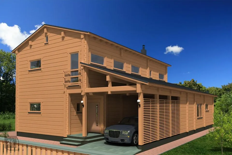 Majale lisavad toredust kõrge kaldkatus ja efektsed puittalad. Maja sissekäigu juures on auto katusealune ja panipaik.