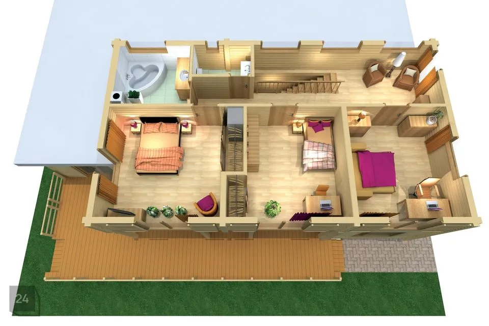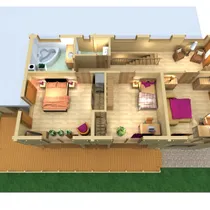 Esimese korruse toas toimivad elegantse tervikuna. Selline paigutus sobib hästi aktiivsele perele kellele meeldib koguneda hubase kaminatule ümber. Kamin asub maja keskel tänu millele saab seda nautida nii köögist ja söögitoast kui ka suurest elutoast. Vestibüülis on ruumikas garderoob ja pääs saunakompleksi. Teisel korrusel on suur magamistuba väga mahuga garderoobi, privaatse vannitoa ja rõduga. Lisaks on teisel korrusel veel 2 magamistuba ning dušširuum.