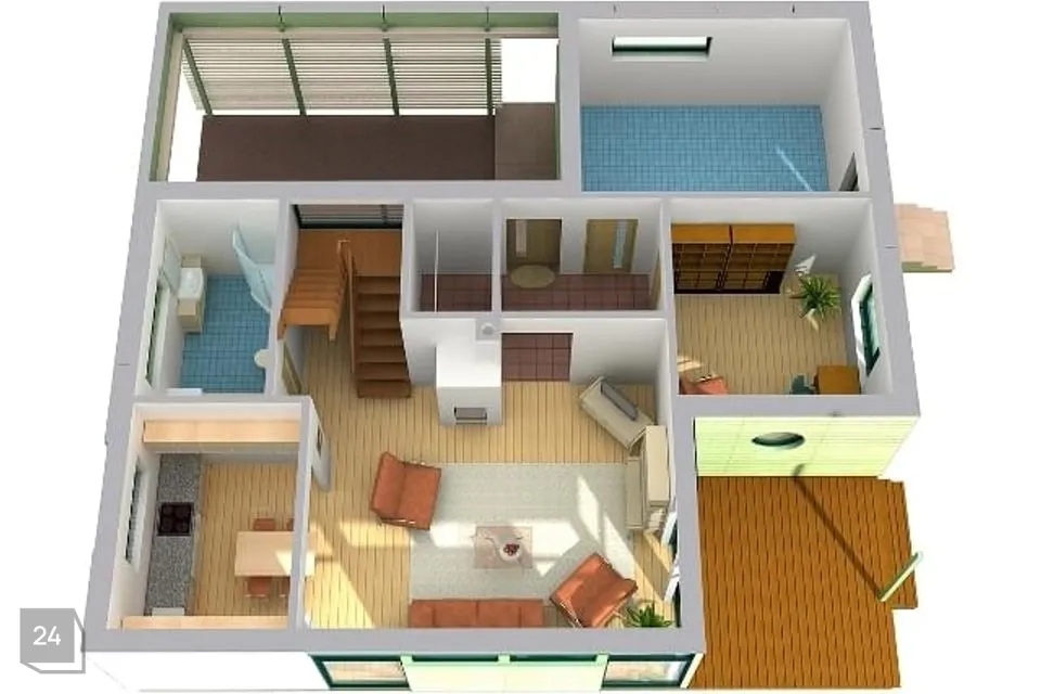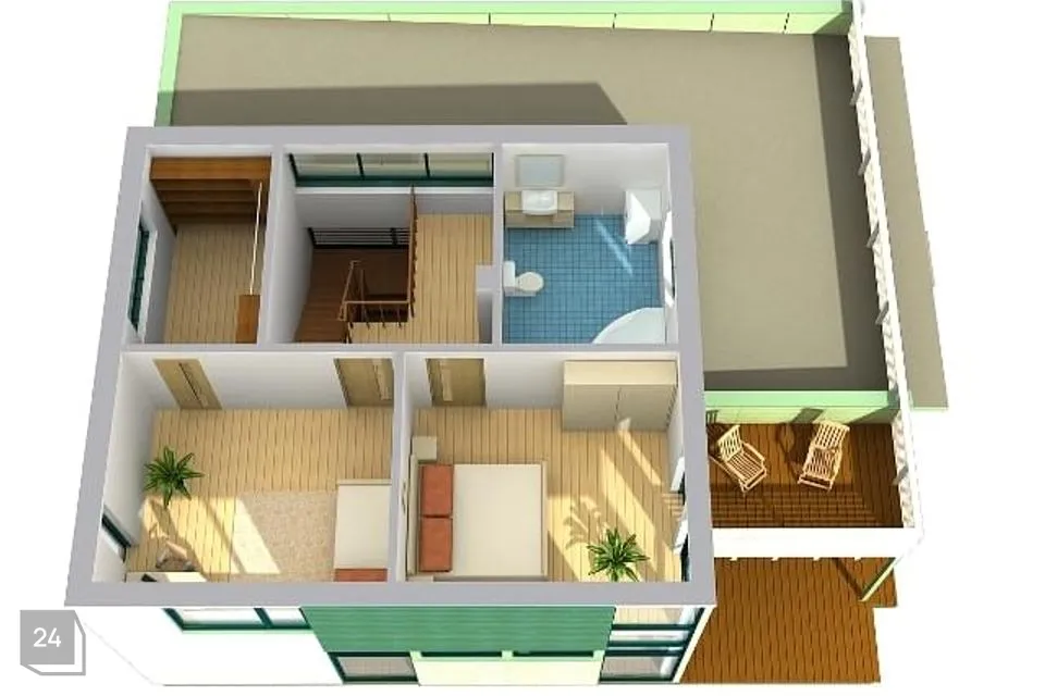 Maja sissekäigu kõrval on väike panipaik näiteks jalgratastele. Esimesel korrusel on avar elutuba-köök, mille õhuruum läheb läbi kahe korruse. Elutoast pääseb suurele terrassile, kuhu mahub hõlpsasti näiteks söögilaud ja grill. Köögi taga on majapidamisruum, mis viib vannituppa ja sauna. Esimesel korrusel on ka 2 magamistuba ning tualett.