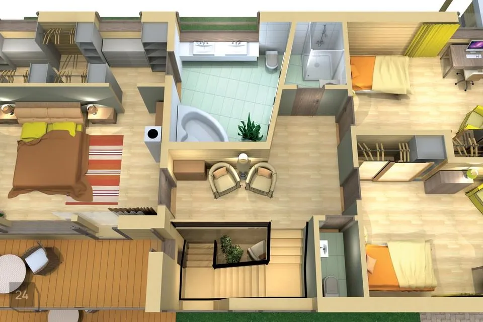 Esimese korruse toas toimivad elegantse tervikuna. Selline paigutus sobib hästi aktiivsele perele kellele meeldib koguneda hubase kaminatule ümber. Kamin asub maja keskel tänu millele saab seda nautida nii köögist ja söögitoast kui ka suurest elutoast. Vestibüülis on ruumikas garderoob ja pääs saunakompleksi. Teisel korrusel on suur magamistuba väga mahuga garderoobi, privaatse vannitoa ja rõduga. Lisaks on teisel korrusel veel 2 magamistuba ning dušširuum.