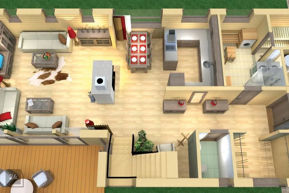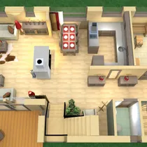 Esimesel korrusel on suur elutuba kaminaga, mis on ühendatud söögitoa ja avatud köögiga, moodustades ühe suure ja avara ruumi. Esimsesel korrusel on ka trepihall, kust pääseb magamistuppa ja vannituppa. Terrassile pääseb nii trepihallist, söögitoast kui ka elutoast.