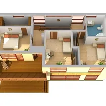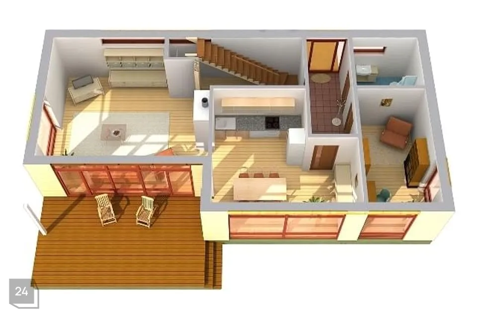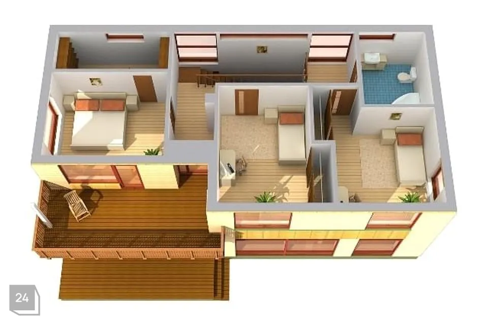 Maja ees on terrass ning sisenedes majja, läbi esiku, jääb vasakule kaks magamistuba ning teisel pool maja on veel üks suurem magamistuba.