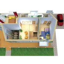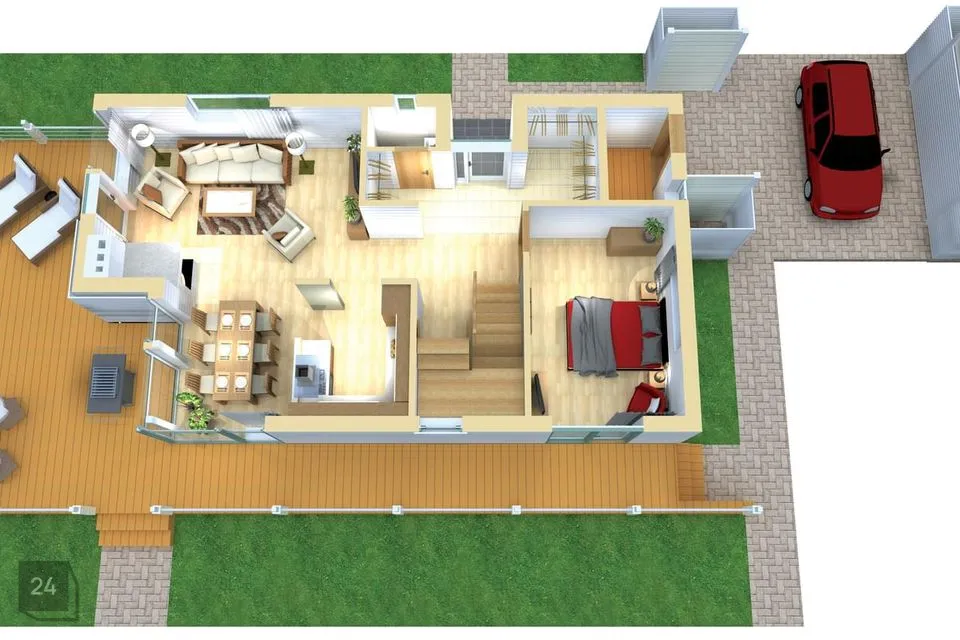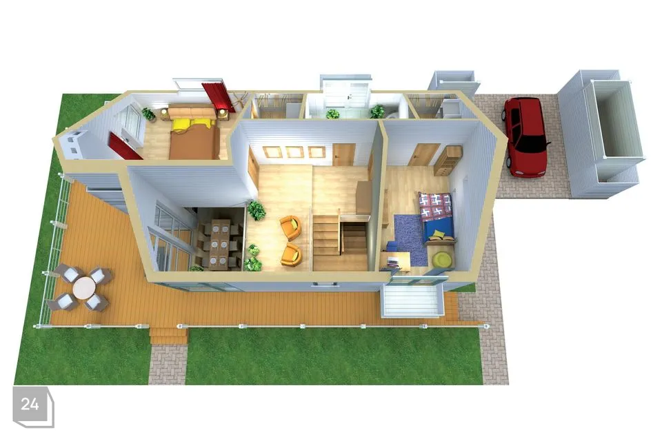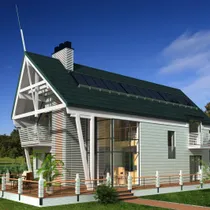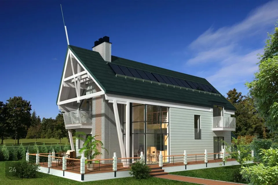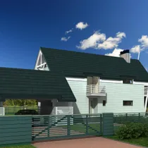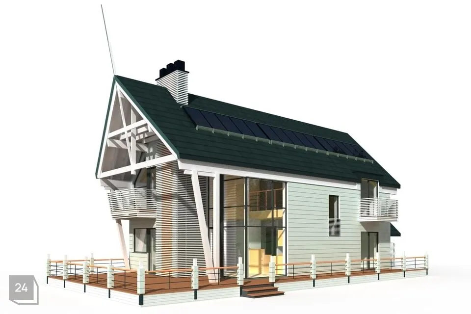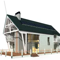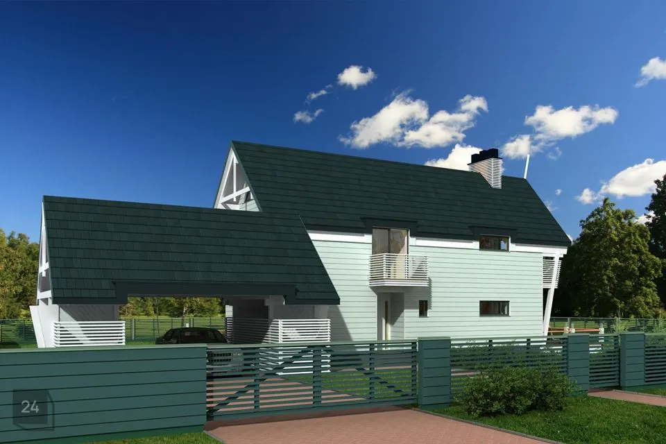 Majale lisavad toredust kõrge kaldkatus ja efektsed puittalad. Maja sissekäigu juures on auto katusealune ja panipaik.