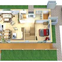 Esimesel korrusel on suur vannituba, mille vastas on magamistuba. Kaminaga elutuba on ühendatud söögitoaga ning mõlemast ruumi osast pääseb suurele välisterrassile. Söögituba on omakorda ühendatud köögiga.