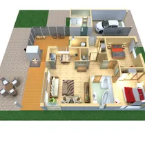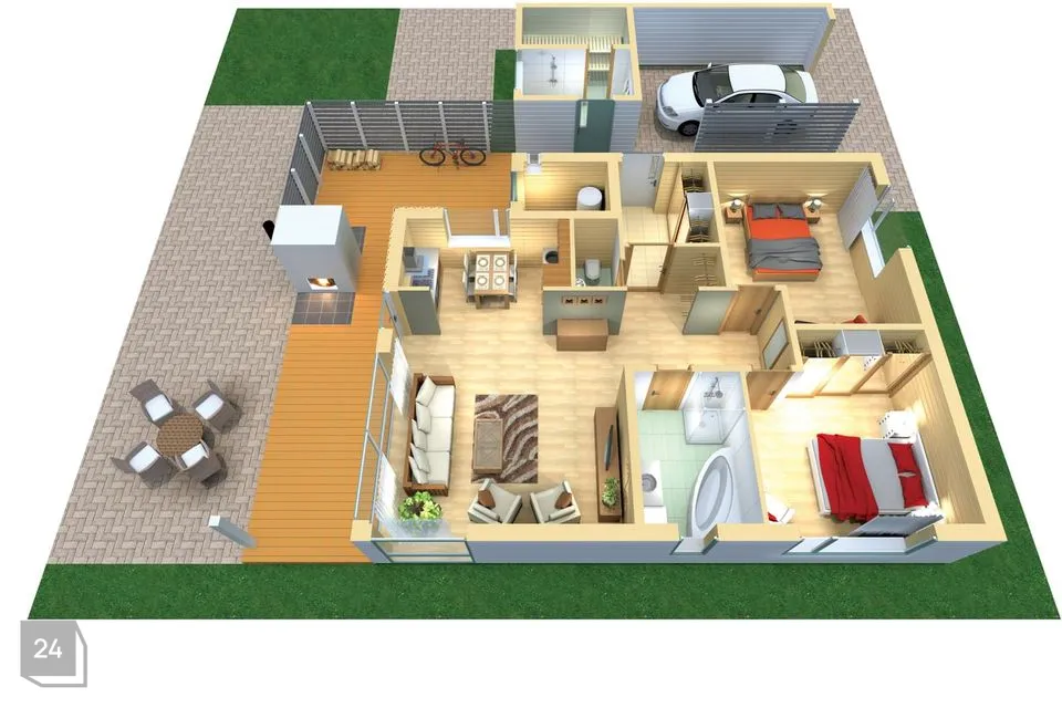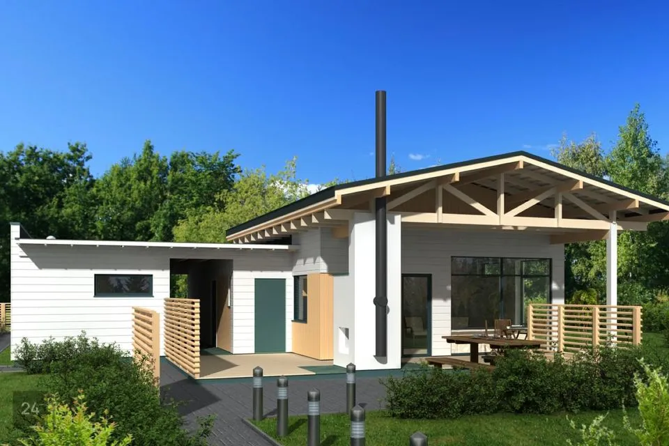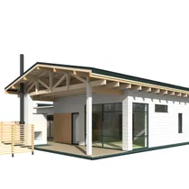 Suured klaaspinnad pakuvad küllusliku valgust nii elutuppa kui ka kööki. Köögi saab jätta avatuks elutuppa või vormistada täiesti eraldiseisva ruumina. Majas on 2 magamistuba ning eraldi tualett ja vannituba. Ei puudu ka eraldiseisev saunakompleks, mis on majaga ühendatud läbi terrassi. Tänu õuekaminale on avaral terrassil suurepärane lõõgastuda varakevadest kuni hilissügiseni välja.