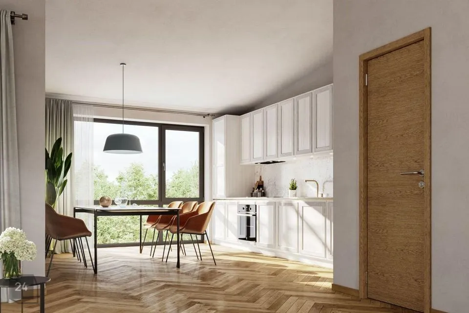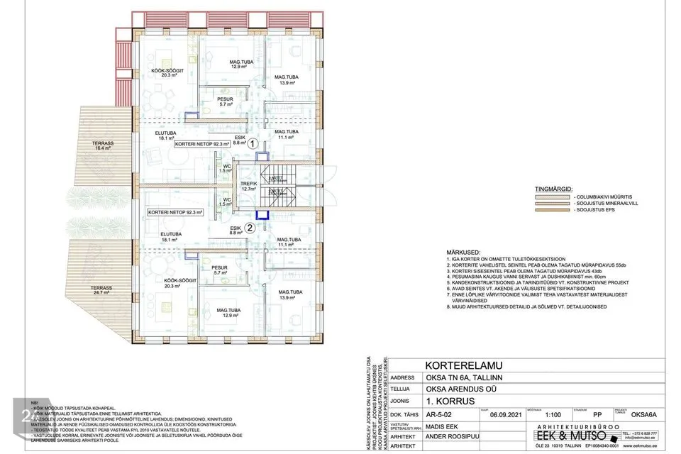 Esimesel korrusel on kaks võrdse suurusega korterit, mille elutoad-köögid maapealsete terrassidega paiknevad hoone edelapoolsel küljel ning magamistoad kirdepoolsel küljel.