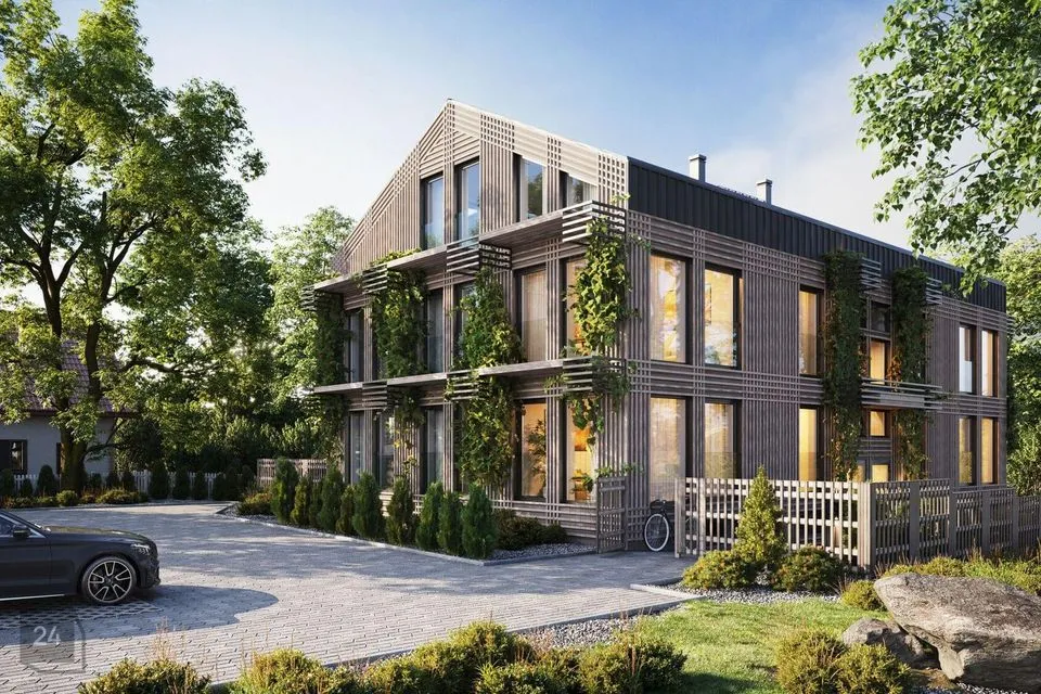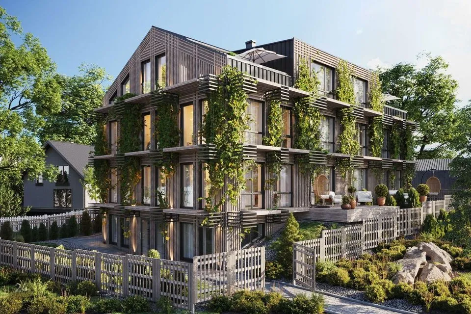Konstruktsioonilt on hoone Columbia kivist väikeplokkidest kandeseintega ning raudbetoonist paneelidest vahelagedega. Fassaadis on kasutatud “puitpunutist” mis moodustab majale monotoonse raamistiku. Puidust raamistiku ühenduskohtadest eenduvad fassaadist omakorda ribilised raamid, mis kannavad lillekaste ning on päikesevarjuks korteritele suurtele akendele. Vertikaalselt on raamide vahele tõmmatud trossid, mida mööda saavad ronitaimed kasvada. Puitlaudisena kasutatud ajas kestvat kuumõlitatud okaspuulaudist või raudsulfaadiga töödeldud lehiselaudist- Mõlema värv hallikas-pruun.